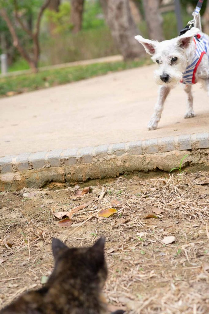 看看下面這張,清楚對焦在狗狗,從他的姿態應該有點激動地想要前撲,視線就會移到前景模糊的貓貓,到這裡主角配角的關係交代了,再看看背景:有樹有草有水泥地,那應該就是公園了。再看看影子,不是很明顯,蠻辦法判斷時間,也因為這樣可以知道是陰天。所以故事就是:那個陰天的公園裡,一隻想要前撲但被主人拉著的狗正在與貓對峙著。這邊還可以多想想:還有無更好的拍攝鏡位?前景的貓要清晰還是模糊好?但,請把時間因素考慮進去,這樣的場面通常不會持續太久。 :)