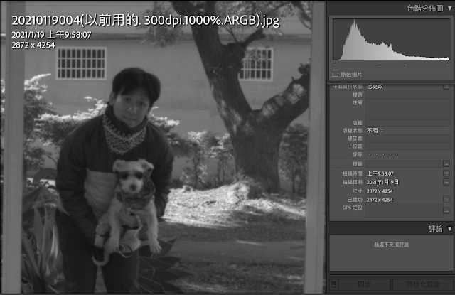 4. 作後兩張是比較看看adobe RBG vs. sRGB:兩者直方圖差不多,在黑白的影像下,兩者差不多應該也是合情合理,但有鋸齒分佈,還是就不考慮了,或許以後到了彩色掃瞄再來試試看。