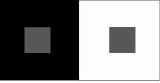 #同時對比 (Simutaneous Contrast): 兩個顏色放在一起,會相互影響,在視覺上形成的顏色會互相入侵,如下圖:黑中的白方塊,會變成灰色,又,白中的黑方塊也會變成灰色。