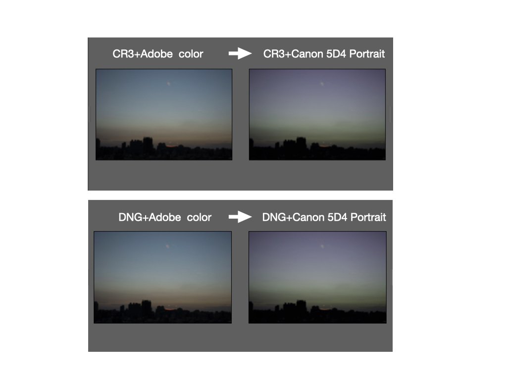 使用RAW檔另一個好處就是可以直接套用描述檔(Profile),方便快速地套上各種不同相機的發色。下圖是同一張照片CR3、DNG套用5D4 Protrait的描述檔,顏色變化也是差不多的,看起來幾乎沒有差異。